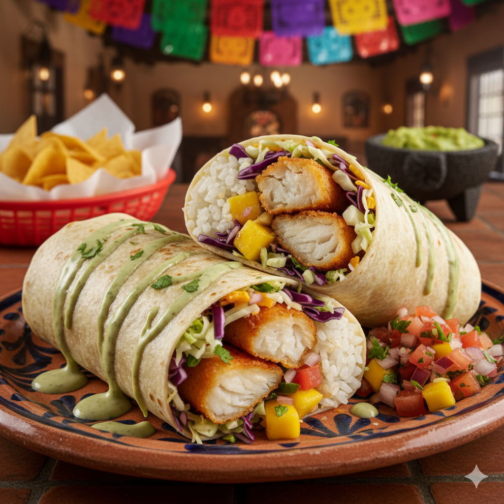Lightly fried cod fish filet, lime rice, shaved cabbage, mixed Mexican cheeses, mango salsa, pico de gallo, cilantro ranch aioli